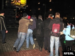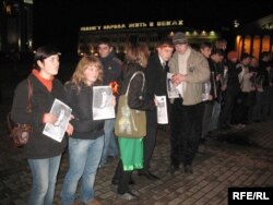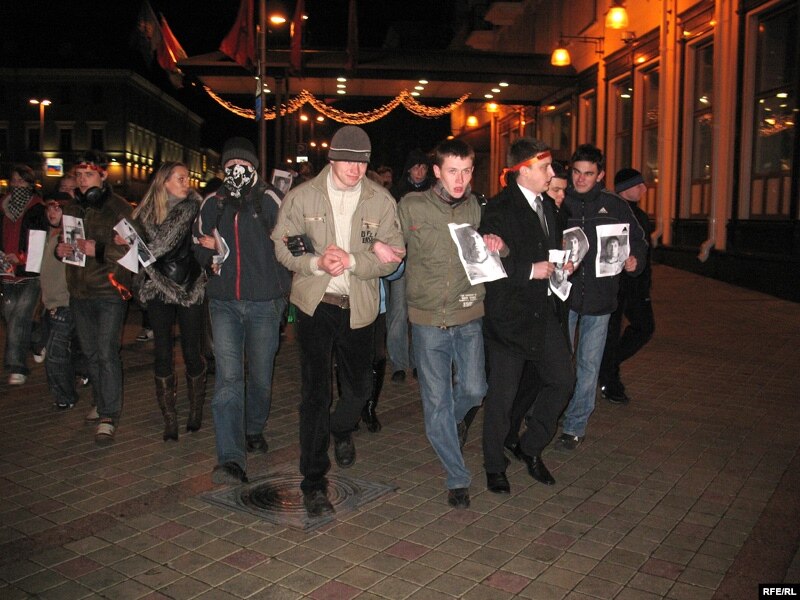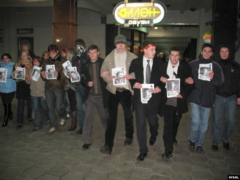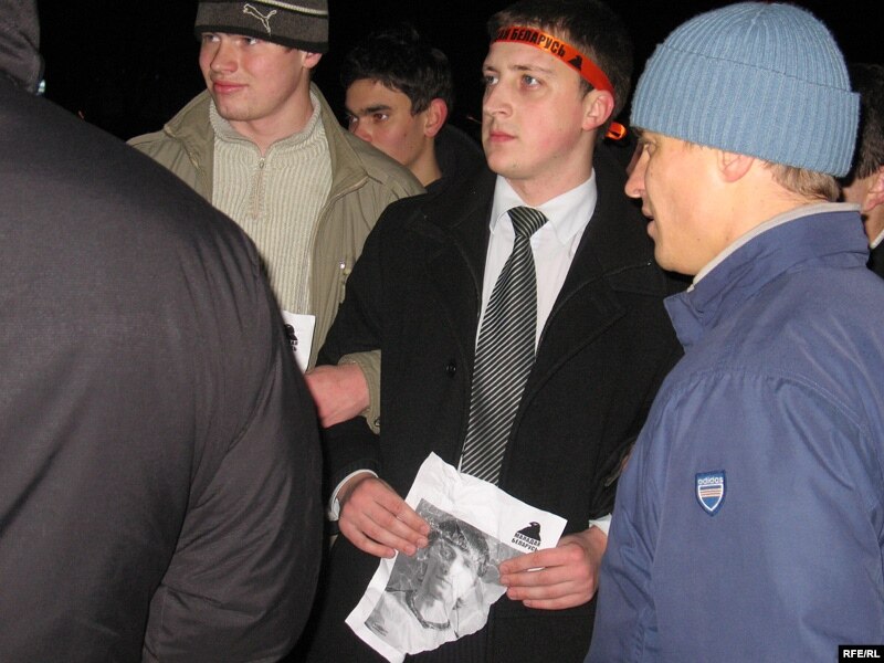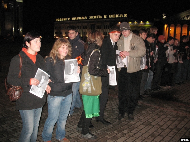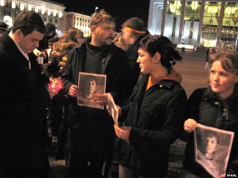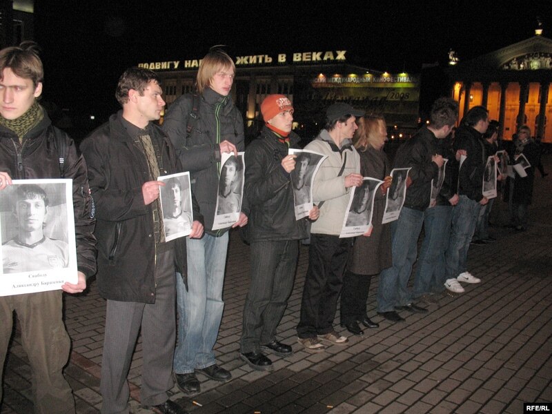 Каля 30-ці сяброў моладзевага руху “Маладая Беларусь” сабраліся а 18-й гадзіне на Кастрычніцкай плошчы. Яны ўтварылі ланцуг і разгарнулі партрэты Аляксандра Баразенкі, а таксама зьніклых апазыцыянэраў Віктара Ганчара, Анатоля Красоўскага і Юр’я Захаранкі. Удзельнікі акцыі таксама трымалі ў руках запаленыя зьнічы. Як толькі ўдзельнікі акцыі пачалі скандаваць “Свабоду Баразенку!”, міліцыянты ў цывільным пачалі выціскаць іх з плошчы. Пры гэтым яны білі дэманстрантаў, адбіралі і рвалі партрэты, разьбівалі аб асфальт зьнічы.