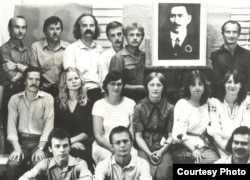Сотыя ўгодкі Івана Луцкевіча. Першы супольны сход майстроўцаў і старэйшых адраджэнцаў. Майстэрня Віктара Маркаўца на вул. Дзімітрава 3 у Менску. Генадзь Мацур першы ўнізе зьлева. 1981 год. Фота з архіву.
