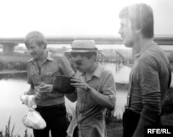 Алесь Суша (у цэнтры) быў заўзятым удзельнікам майстроўскіх вандровак. Нёманскае падарожжа на надзіманым плыце. 5 жніўня 1983 году. Побач Ігар Гермянчук і аўтар.