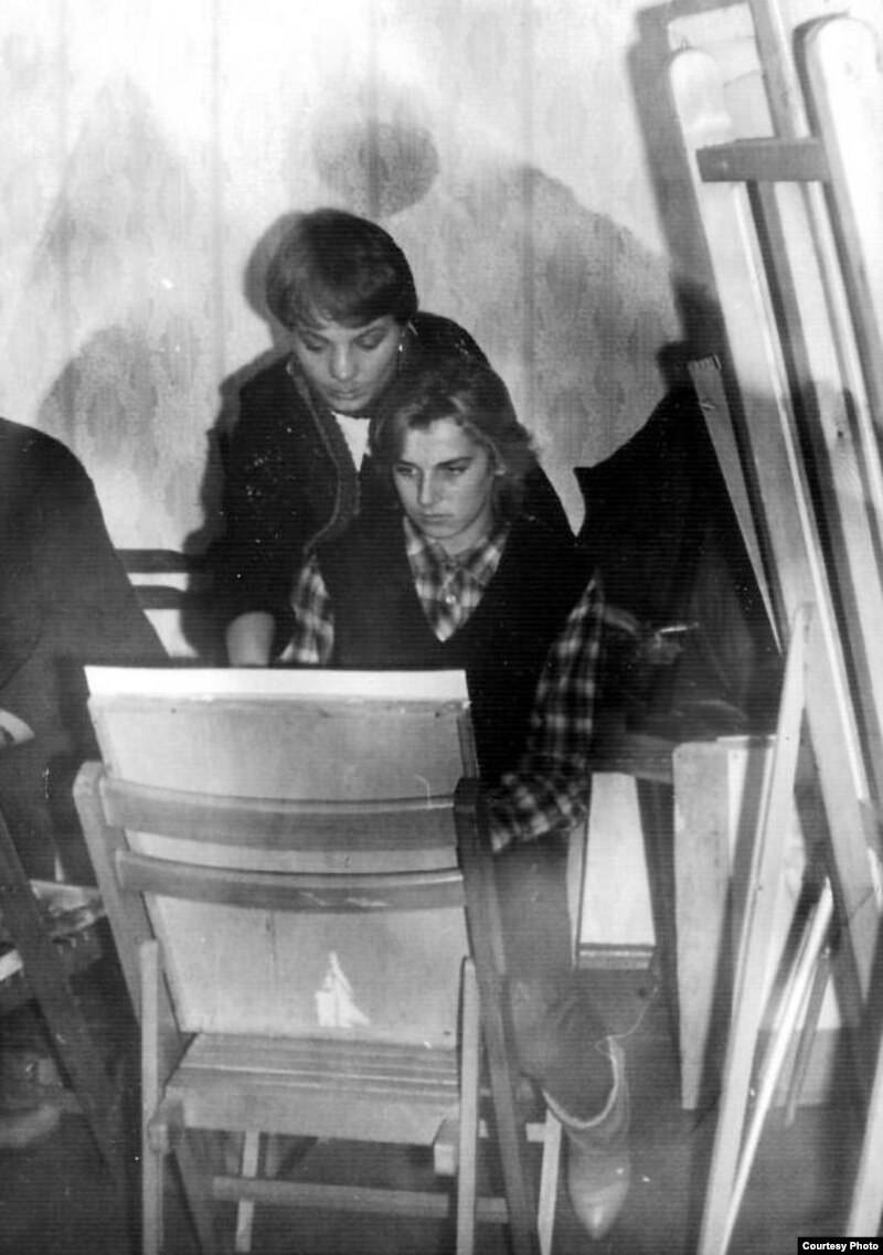 Калі я хадзіла на Майстроўню, я працавала. Пасьля “парнату” я не паступіла першы год і пайшла працаваць мастаком-афарміцелем. А ўсе мае аднаклясьнікі вучыліся ў Акадэміі мастацтваў. Я й жыла недалёка, на Бялінскага. Прыехала Сьвета Слуцкая, жыла ў мяне, і мы разам хадзілі на Майстроўню.