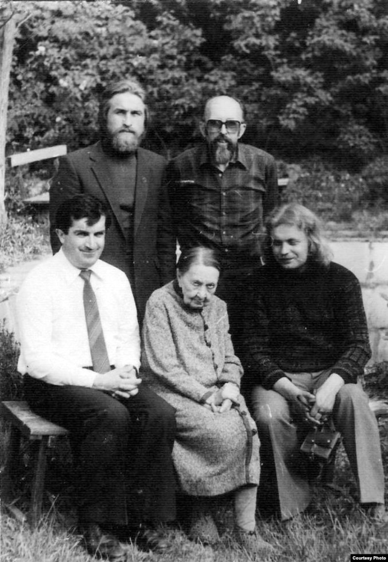 У гасьцях у Зоські Верас. 1985 год. Стаяць Генадзь Сагановіч і Лявон Луцкевіч. Сядзяць Эдвард, Зоська Верас, Сяржук Сокалаў-Воюш.