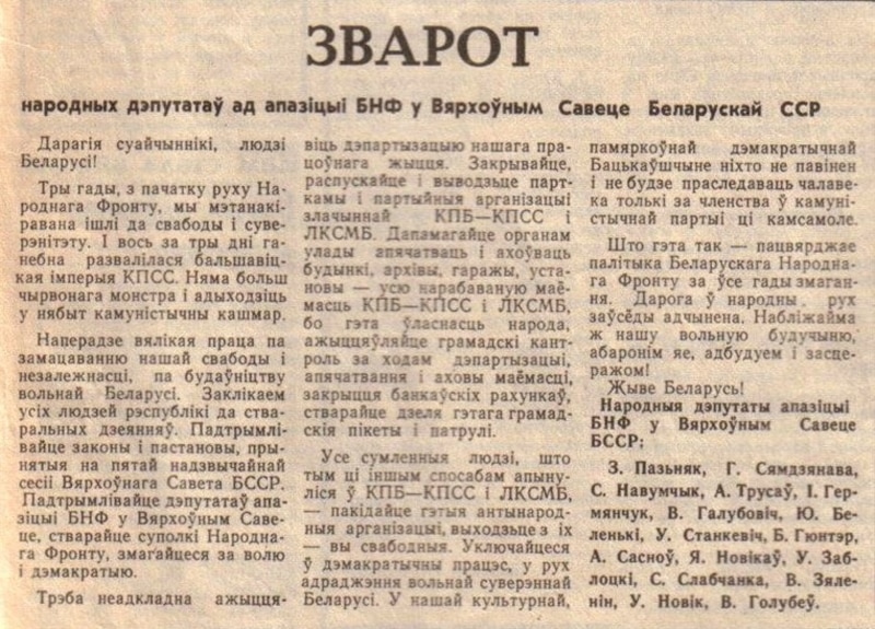 Мушу адзначыць, што тады ў Беларусі пра імпэрскасьць Расеі і падвойнасьць яе “дэмакратаў” яшчэ не гаварылі і нават ня думалі. Некаторыя з дэпутатаў Дэмклюбу закруцілі насамі, што ня быў мной ухвалены Ельцын (сьвятая на той час карова абстрактнай савецкай “дэмакратыі”). Але гэтая іхняя нездаволенасьць ня мела тут ніякага значэньня. Нам трэба было забраць усе галасы парлямэнцкай бальшыні, стварыць адзінства ў залі і завершыць змаганьне з бляскам. А ў гэтым выпадку трэба было проста ўратаваць незалежнасьць.
