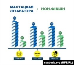 Cуадносіны нон-фікшн і мастацкай літаратуры цалкам зьмяняюцца ў параўнаньні з чытацкім галасаваньнем (нон-фікшн становіцца ў чатыры разы больш: было 2 кнігі з 20, стала 20 з 50). Крыху асабняком стаіць «Споведзь» Ларысы Геніюш, якая за шаснаццаць год апусцілася на дзесяць пазыцый уніз, і «Энцыклапедыя Вялікага Княства Літоўскага», дзецішча 2000-х і плён працы некалькіх пакаленьняў гісторыкаў. А вось жаночыя прозьвішчы не зьмяніліся: усё тыя ж Алексіевіч, Арсеньнева, Геніюш і Цётка (8% ад агульнай колькасьці кніг), адно згубіўся недзе ў дарозе першы зборнік Ларысы Антонаўны, а змагарска-тэрарыстычны Цёткаў «Хрэст на свабоду» зьмяніўся асьветніцкім «Першым чытаньнем для дзетак-беларусаў».