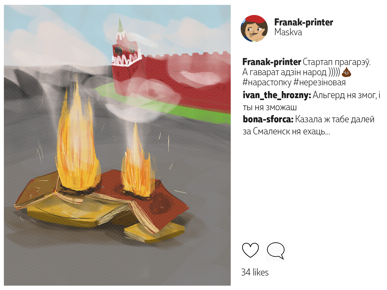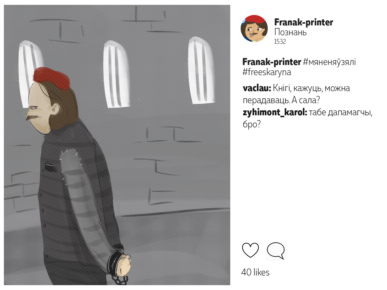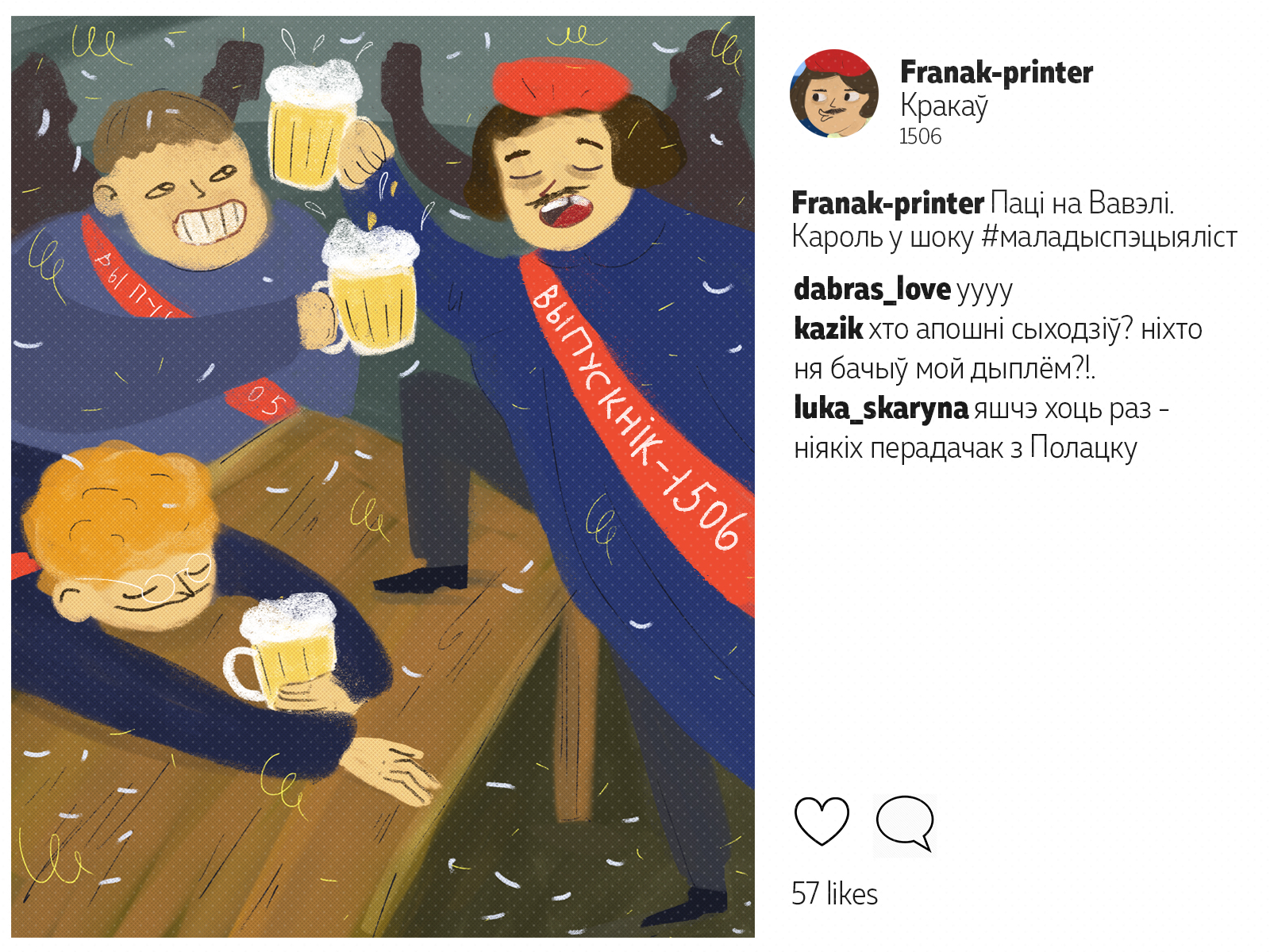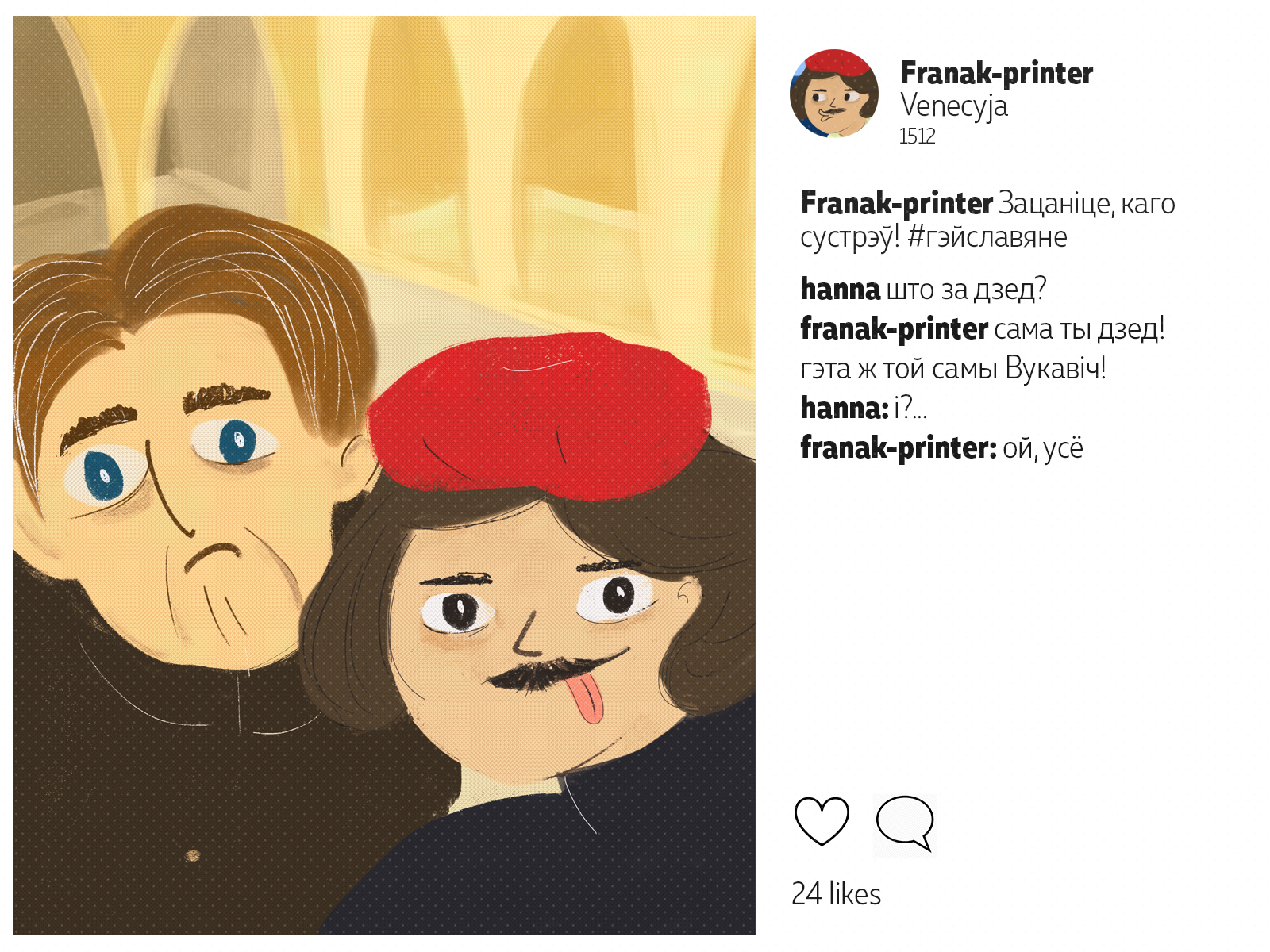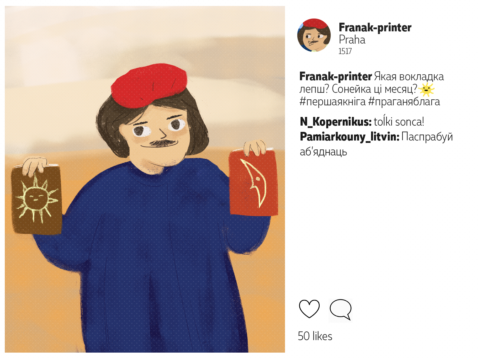 Францішак Скарына падарожнічаў ня менш за каторага сучаснага маладзёна. Ураджэнец Полацку, ён аб'ехаў палову Эўропы*: ад Вэнэцыі да Масквы. Пакінуў сьлед ва ўнівэрсытэтах Польшчы і Вэнэцыянскай рэспублікі, пры каралеўскіх дварах Даніі і Чэхіі. У Познані ён адседзеў у астрогу, а з Саксоніі ад яго ўцякаў Марцін Лютэр. Мы падумалі, што Скарына абавязкова карыстаўся б сацсеткамі. І вось як мог бы выглядаць ягоны інстаграм.