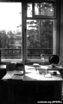 Я спадзяваўся, што спадарыня Ізабэла ўспомніць, дзе ж быў той нумар, у якім жыў Караткевіч. Але мая спадарожніца не пазнала інтэр’еру. Гэта ня дзіва. Бо корпус неаднойчы рэканструявалі. У Ізабэлы Гатоўчыц ад той вясны засталося некалькі фатаздымкаў. Вось пакой Караткевіча. Пісьмовы стол каля вакна, масіўная попелка, аркушы паперы.