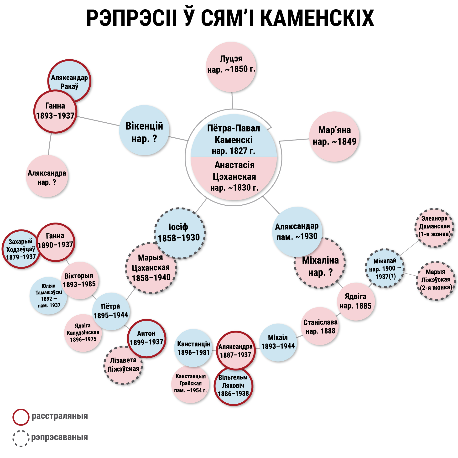 У 1920-я пачаўся перасьлед ужо ягоных крэўных. Усе яны жылі ў Воршы і ваколіцах. Прапрадзед Ёсіф і прапрабабка Марыя Каменскія жылі на хутары Глякава пад Воршай. Як заможную сям’ю іх раскулачылі ў 1930 годзе і выслалі ў Котлас — горад у Архангельскай вобласьці на поўначы Расеі. 72-гадовы бацька спрабаваў уцячы, але патануў у рацэ. Маці потым вярнулася ў Воршу і памерла ў 1940 годзе.