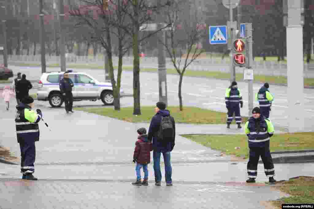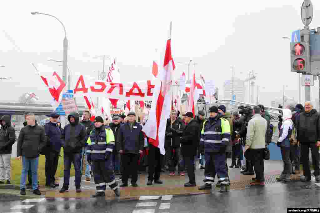 Арганізатары і супрацоўнікі міліцыі абараняюць пікет ў падтрымку кандыдата ў дэпутаты з чырвона-зялёным сьцягам ад магчымых правакацый
