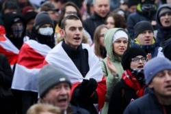 14:14 Пратэстоўцы сьпяваюць «Пагоню», у натоўпе чуваць воклічы «Жыве Беларусь».