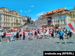 Уся Старамесцкая плошча ў Празе сёньня была беларускай. Сюды прыйшлі некалькі сотняў дэманстрантаў. Па-беларуску, па-чэску, па-ангельску яны патрабавалі свабоды палітвязьням, зьняволеным за салідарнасьць грамадзянам і блогерам Беларусі.