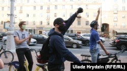 Падчас акцыі салідарнасьці ў Менску 14 ліпеня былі выпадкі, калі пратэстоўцы адбіваліся ад міліцыянтаў, а таксама не дазвалялі міліцыі затрымаць іншых людзей.