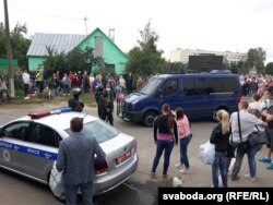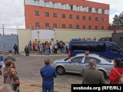Перад будынкам стаіць каля 10 аўтазакаў. Па словах людзей, яшчэ 7 аўтазакаў за брамай турмы. На даху турмы сядзяць людзі ў чорным. Людзі мяркуюць, што гэта снайпэры.