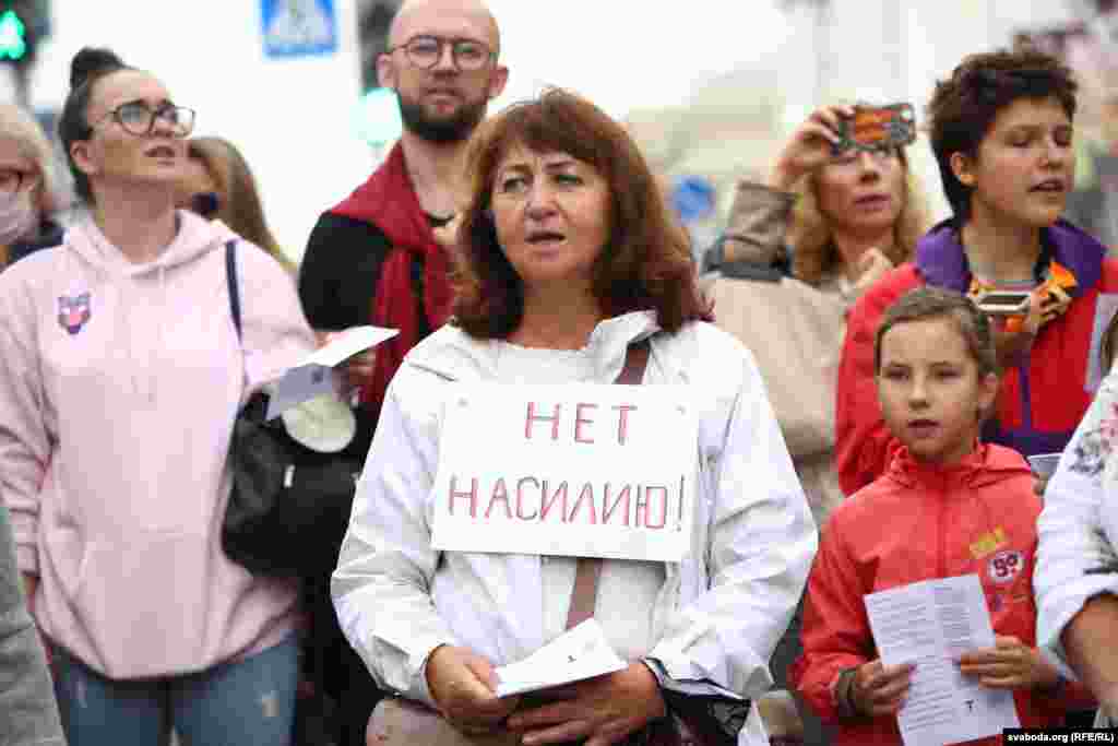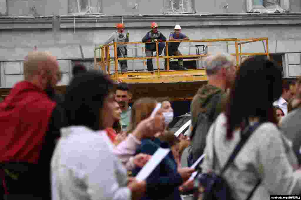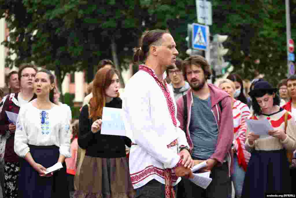 Каля 50 актывістаў утварылі кола каля галоўнага ўваходу ў Купалаўскі тэатар. Некаторыя ў народных строях, сьпявалі «Рэчаньку». Музыка Сяржук Доўгушаў сказаў, што людзі зьбіраюцца прыходзіць сюды штодня а 12-й, а потым зьбірацца каля філярмоніі, дзе таксама будуць сьпяваць. Будаўнікі, якія працавалі побач, пагадзіліся на паўгадзіны прыпыніць шумныя працы.