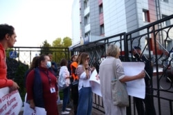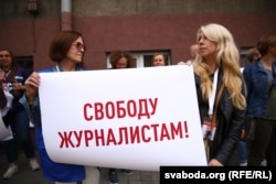 «Прэса — гэта сьвятое. Юры Караеў», «Свабоду журналістам», «Рабілі сваю працу — апынуліся на Акрэсьціна» — з такімі плякатамі прысутныя журналісты Tut.by, «Онлайнеру», «БелаПАН», «Нашай нівы» і іншых мэдыя сталі насупраць будынку МУС.