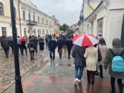 На вуліцы Савецкай у Гомлі затрымалі дзьвюх жанчын, якія гулялі пад бел-чырвона-белымі парасонамі. Людзі ходзяць па Савецкай групамі, з кветкамі і букетамі з восеньскага лісьця. На ўсіх скрыжаваньнях стаяць міліцыянты, АМАП.