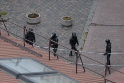 Пад гатэлем «Турыст» стаяць тры мікрааўтобусы з амапаўцамі ў чорнай форме. Яны са зброяй і стралялі (магчыма, у паветра). Вакол іх сабраліся пратэстоўцы.