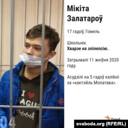 Мікіта — дзевяціклясьнік з Гомля. Яго затрымалі за пратэсты 10 жніўня і абвінавацілі ў тым, што кінуў «кактэйль Молатава» у бок вайскоўцаў. Бутэлька ўпала побач з байцамі і не нанесла ім шкоды.