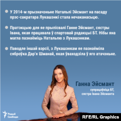 Прызначэньне Натальлі Эйсмант на пасаду прэс-сакратара Аляксандра Лукашэнкі ў 2014 годзе стала нечаканасьцю. Узьнікла нават невялікая блытаніна, і журналісты пачалі званіць з просьбай аб камэнтары не Натальлі, а сястры яе мужа Ганьне. Ужо пасьля падзей жніўня 2020 году мадэльер Аляксандар Варламаў, які цяпер жыве ў эміграцыі, расказаў, што менавіта Ганна Эйсмант магла пазнаёміць Натальлю з Лукашэнкам. Прыпісвалі Ганьне Эйсмант і пратэкцыю для брата Івана. Працуючы ў спартовай рэдакцыі БТ, яна часта езьдзіла з афіцыйнымі дэлегацыямі на спаборніцтвы і была асабіста знаёмая як з Лукашэнкам, так і з кіраўнікамі спартовых фэдэрацый, якія ўзначальваюць пераважна ўплывовыя сілавікі і бізнэсоўцы.