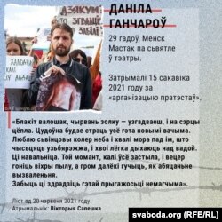 - Затрымалі 16 кастрычніка 2020 году. Асудзілі на 2 гады калёніі за «пратэсты» і «гвалт над міліцыяй».
