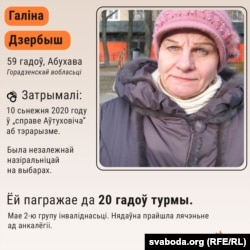Пэнсіянэрку Галіну Дзербыш з Абухава Горадзенскай вобласьці затрымалі летась 10 сьнежня. Яна праходзіць па так званай «справе Аўтуховіча». Жанчыну падазраюць у акце тэрарызму, ёй пагражае да 20 гадоў зьняволеньня.