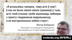 Мне ня сорамна перад сваёй сям’ёй, перад жонкай і дзецьмі. Нават нягледзячы на тое, што сын знаходзіцца ў турме, бо асноўная віна яго ў тым, што ён мой сын», — кажа Віктар Бабарыка.