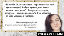 «Я беларуска. Я маю права на свабоду меркаваньняў, перакананьняў і свабоду выяўленьня. Карыстаючыся гэтым правам, я ніколі не выходзіла за межы заканадаўства Рэспублікі Беларусь. Я не злачынца. Мне 19 гадоў, я далёкая ад палітыкі, але ёсьць рэчы, для разуменьня якіх узрост ня мае значэньня. Я выйшла ня супраць улады, я выйшла супраць гвалту, прыніжэньня, беззаконьня і ілжы, таму што мяне немагчыма прымусіць глядзець і ня бачыць...