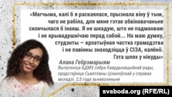 Выпускніца БДМУ, сябра Каардынацыйнай рады Алана Гебрэмарыям, якую Сьвятлана Ціханоўская прызначыла сваёй прадстаўніцай у справах моладзі, 16 ліпеня 2021 году была асуджаная на 2,5 года зьняволеньня.