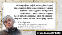 Актывістку ЗБС Кася Будзько, якая навучалася ў пэдагагічным унівэрсытэце, 16 ліпеня 2021 году асудзілі на 2,5 года зьняволеньня.
