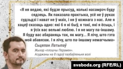 «Я ня ведаю, які будзе прысуд, колькі насамрэч буду сядзець. Як паказала практыка, усё не ў руках судзьдзі і нават не ў маіх, і ня ў кожнага з нас. Але я хацеў сказаць адно: які б я ні быў, я такі, які я ёсьць, і я ўсіх вас вельмі люблю. І я не магу па-іншаму. Я буду вас абараняць так, як магу... Я лічу, што гэта мой абавязак. І я лічу, што па-іншаму немагчыма», — сказаў Сьцяпан Латыпаў.