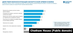 Астапеня: «23% апытаных кажуць, што калі б беларускае войска паслалі на вайну ва Ўкраіне, то войска выконвала б загады. Іншыя адказы — пра розныя спосабы ўхіленьня ад выкананьня загаду. Адказы паказалі, што ў беларусаў няма пэўнага ўяўленьня пра тое, што дакладна будуць рабіць беларускія вайскоўцы, калі ім загадаюць ісьці ваяваць з украінцамі. Але большасьць людзей думаюць, што калі вайскоўцаў пашлюць на перадавую, яны будуць імкнуцца ўхіліцца ад баявых дзеяньняў».