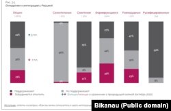 Геапалітычныя прыярытэты выяўляюцца ў адказах на пытаньне аб падтрымцы аднаго з бакоў у расейска-украінскай вайне: 41% адмаўляецца займаць які б то ні было бок, 39% выказваюць падтрымку Расеі і 20% — Украіне. Прарасейскую пазыцыю займае большасьць прыхільнікаў цяперашняй улады ў Беларусі (77%) і аўдыторыі дзяржаўных мэдыя (60%). Сярод праціўнікаў улады Ўкраіну падтрымліваюць 66%, а сярод аўдыторыі недзяржаўных мэдыя — 44%. Словам, сэгмэнты з прарасейскім патэнцыялам кансалідавана выступаюць у падтрымку Расеі, тады як патэнцыйна праўкраінскія сэгмэнты часьцей сыходзяць у нэўтралітэт.