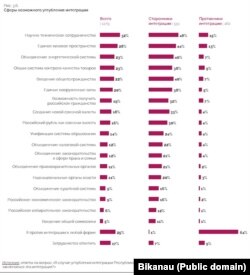 Беларусы падзеленыя ў пытаньні інтэграцыі з Расеяй. У параўнаньні зь мінулым годам вырасла доля прыхільнікаў інтэграцыі, і зараз іх больш, чым праціўнікаў, хоць ніводную з пазыцыяў не падтрымлівае большасьць.