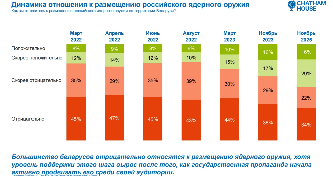 — Я думаю, што справа перадусім усё ж у прапагандзе, яна здолела пераканаць многіх беларусаў. У 2022 годзе гэтая ініцыятыва была яшчэ далёкая ад рэалізацыі, таму частка нават прыхільнікаў Аляксандра Лукашэнкі была супраць разьмяшчэньня ў Беларусі расейскай ядзернай зброі. Але з цягам часу прапаганда ўключылася, Лукашэнка ўпарта даказваў, што гэта важна для абароны дзяржавы, што гэта будзе гарантыяй, што ніхто не нападзе на Беларусь.