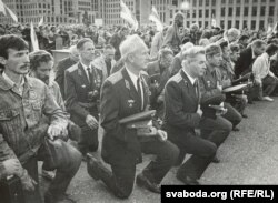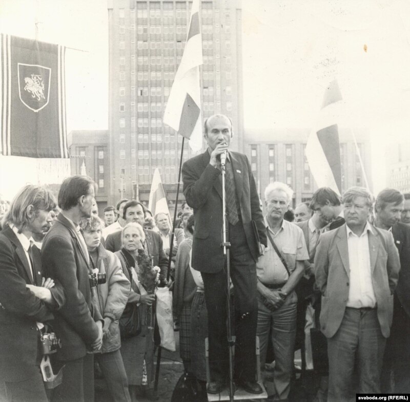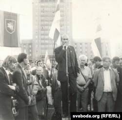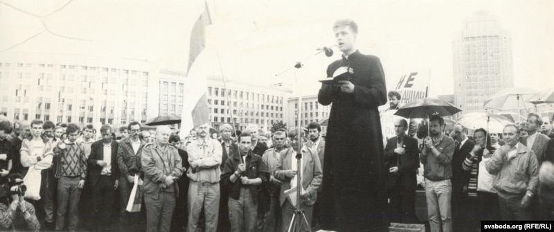 Мітынг супраць ГКЧП, арганізаваны дэпутатамі Апазыцыі БНФ. 20 жніўня 1991 г. Выступае айцец Андрэй Абламейка.