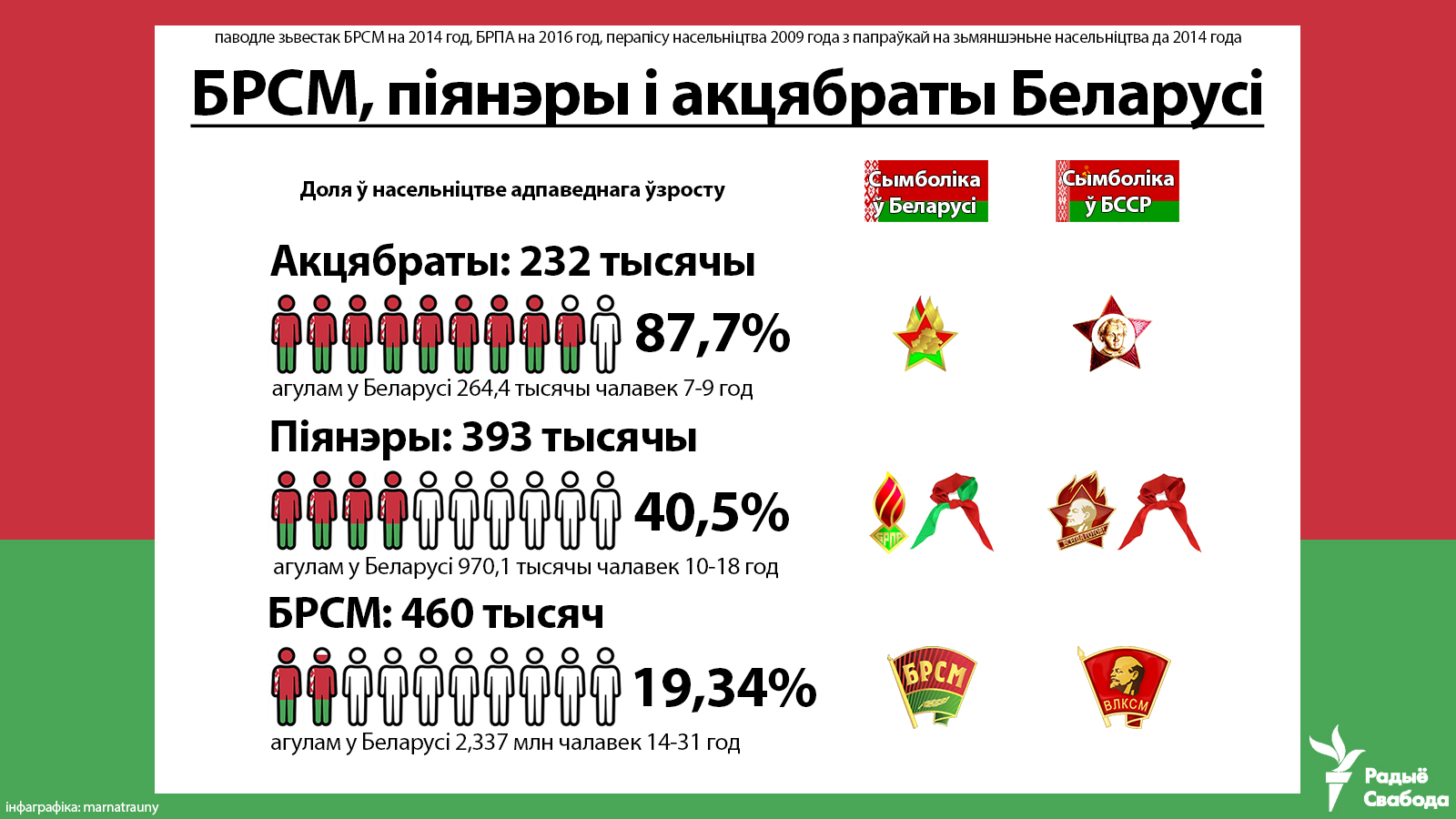 «Яны ўсё ж вымусілі дачку павесіць піянэрскую анучку з камунісцкімі колерамі сабе на шыю», — у піянэрах па афіцыйных зьвестках 4 зь 10 дзяцей адпаведнага ўзросту, у акцябратах — да 9 зь 10.