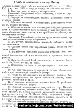 — Ужо ў 1897 годзе была выдадзена губэрнатарская пастанова «Аб язьдзе на роварах па горадзе Менску». Паводле гэтай пастановы нельга было езьдзіць без нумарнога знака, забаранялася езьдзіць па парках і ходніках, трымацца трэба было правага боку. Забаранялася езьдзіць і падчас пахавальных працэсіяў, хросных ходаў. З гэтага можна зразумець, што ровар успрымалі яшчэ як модную забаву, якой не было месца ў сурʼёзны момант. Апроч таго, гэтая пастанова рэглямэнтавала рух раварыстаў паблізу ад конных вазоў, гужавога транспарту: нельга было даваць гучныя сыгналы клаксонам, нельга было абганяць, нельга было ніяк трывожыць коней. Адным словам, раварыстаў у тым годзе, з аднаго боку, афіцыйна прызналі, а з другога — паказалі, дзе іхнае месца. І гэтае месца тады было яшчэ даволі «завужанае» і ня надта пачэснае.