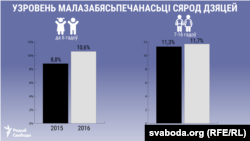 Паводле статыстычнага зборніка Белстату пра ўзровень жыцьця насельніцтва, у 2016 годзе ў Беларусі 10,9% насельніцтва ва ўзросьце да 17 год уключна адносіліся да малазабясьпечаных — наяўных рэсурсаў у іх было менш за пражытачны мінімум, нацыянальную мяжу беднасьці.