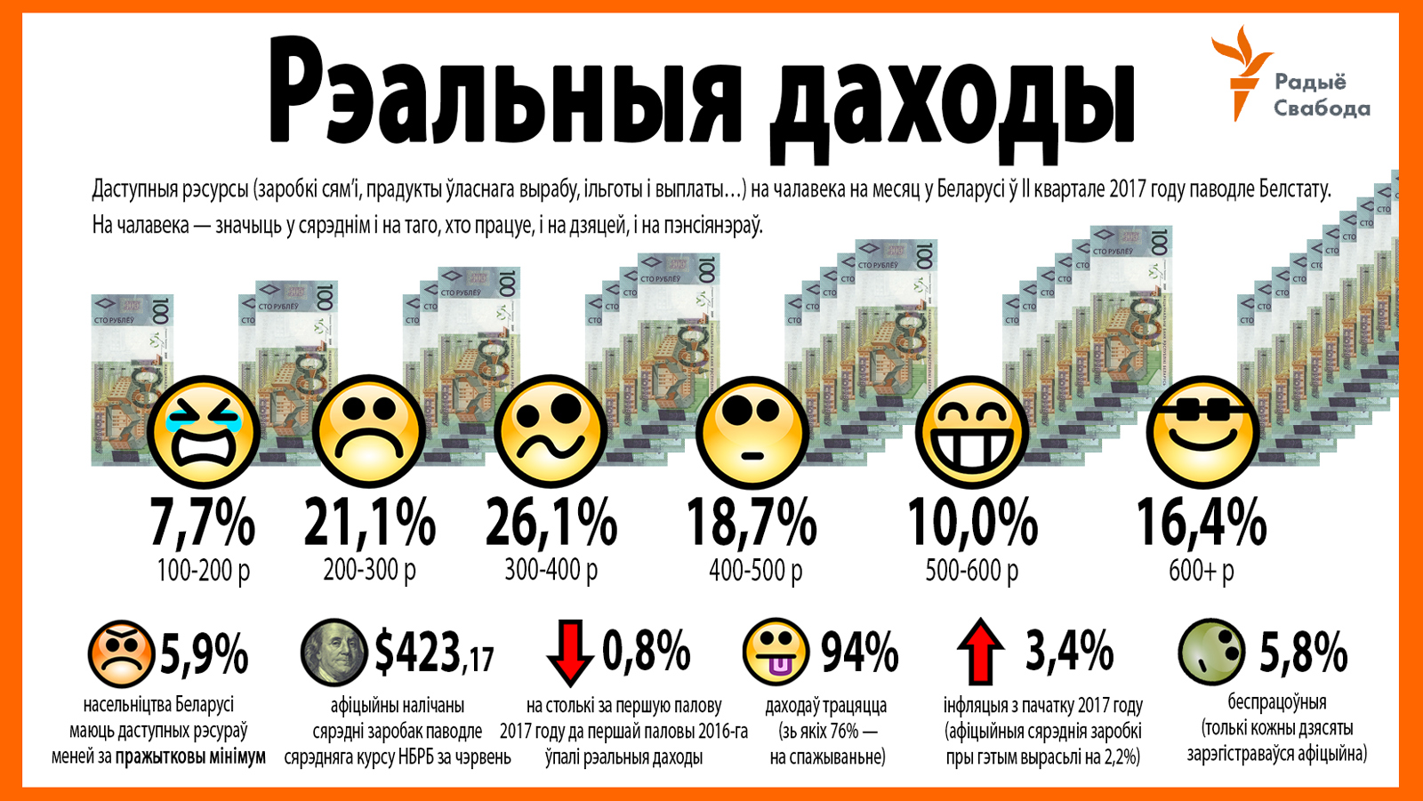 73,6% беларусаў цяпер маюць менш за 500 рублёў рэальных даходаў (даступных рэсурсаў – гэта заробкі сям’і, прадукты ўласнага вырабу, ільготы, выплаты і іншае), а 5,9% беларусаў маюць меней за пражытковы мінімум.