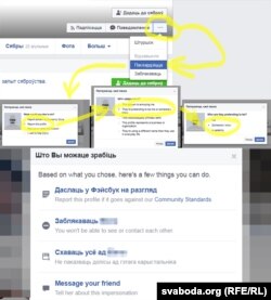 Далейшае мэню на момант публікацыі перакладзенае на беларускую толькі часткова. У ім трэба выбраць, пра што менавіта вы хочаце паведаміць — у выпадку фэйкавага акаўнту гэта «Report this profile» (паведаміць пра гэты профіль). У наступным мэню — «They're pretending to be me or someone I know» («Яны прытвараюцца мной ці кімсьці, каго я ведаю»), калі старонка імітуе рэальнага чалавека, або «Гэта несапраўдны ўліковы запіс» («This is a fake account»), калі імітуе несапраўднага або гістарычнага пэрсанажа. Затым папросяць удакладніць, каго імітуе акаўнт: у выпадку сапраўднага чалавека на выбар прапануюць «Me» («Мяне»), «Someone I know» («Кагосьці, каго я ведаю») і «A celebrity» («Вядомую асобу»).